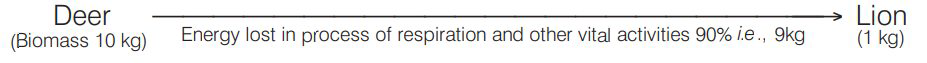 In relation to energy transfer in ecosystem, explain the statement " 10 kg of deer's meat is equivalent to 1 kg of lion's flesh".